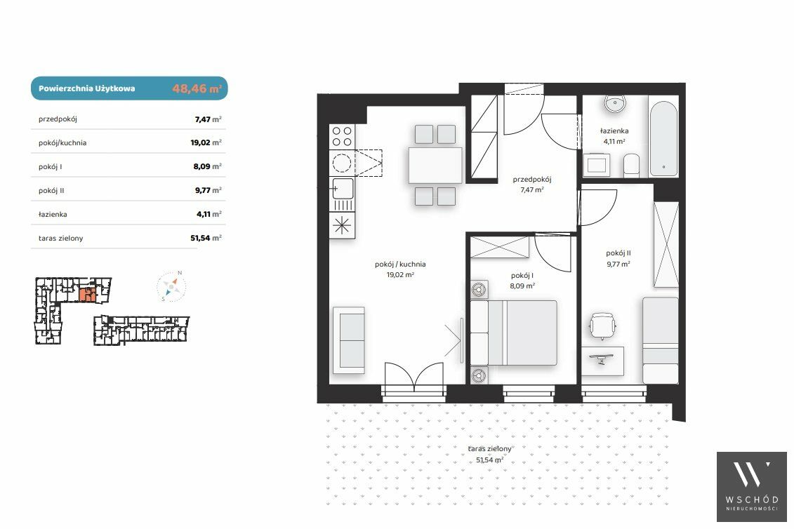 Mieszkanie składające się z salonu z aneksem kuchennym, dwóch sypialni, przedpokoju, łazienki oraz ogródka o pow. 51m2