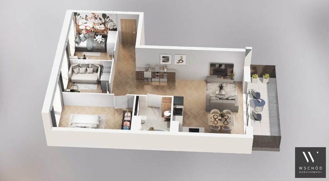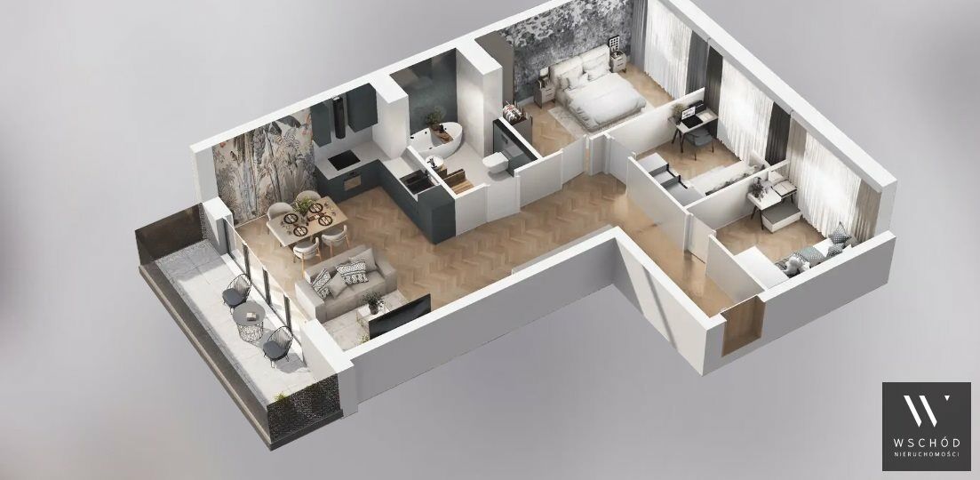 Mieszkanie składające się z salonu z aneksem kuchennym, trzech pokoi, przedpokoju, łazienki oraz balkonu o pow. 8m2