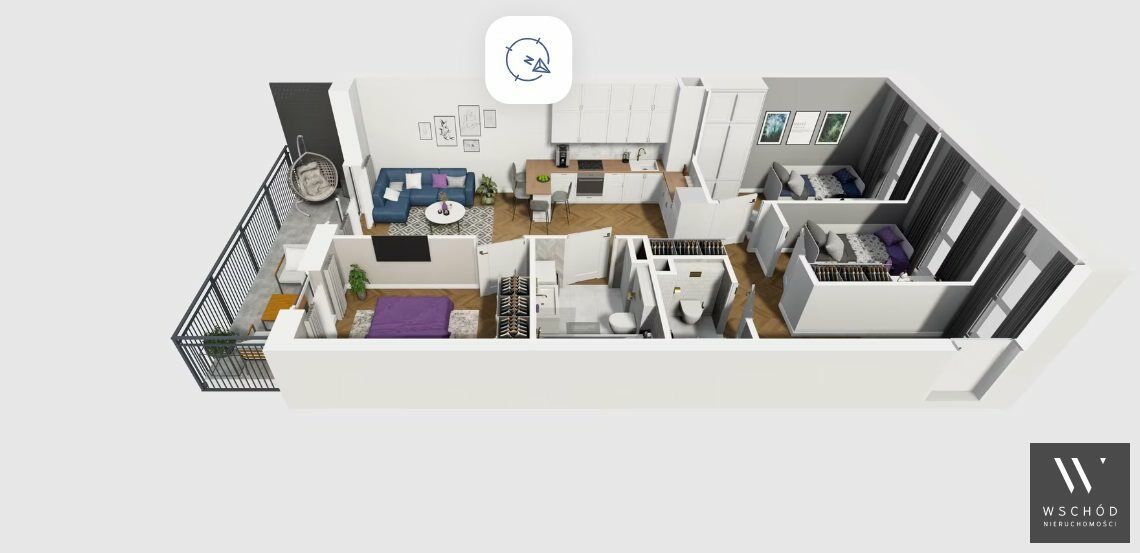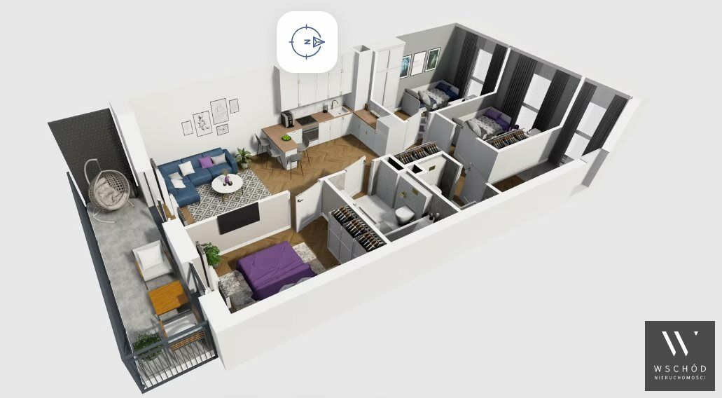 Mieszkanie składające się z salonu z aneksem kuchennym , trzech sypialni, przedpokoju, łazienki, WC oraz balkonu