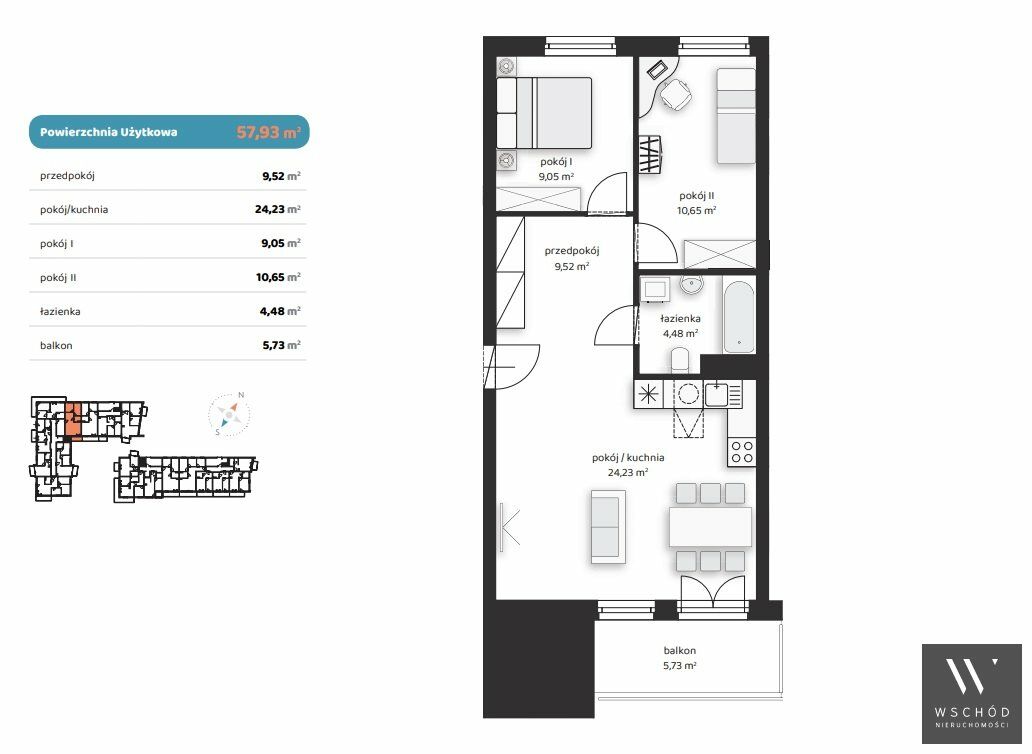 Mieszkanie składające się z salonu z aneksem kuchennym, dwóch sypialni, przedpokoju, łazienki oraz balkonu