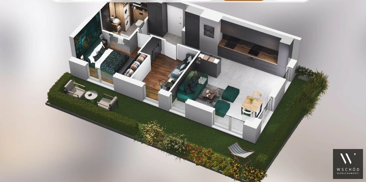 Mieszkanie składające się z salonu z aneksem kuchennym, dwóch sypialni, przedpokoju, łazienki oraz narożnego ogródka o pow. 40m2