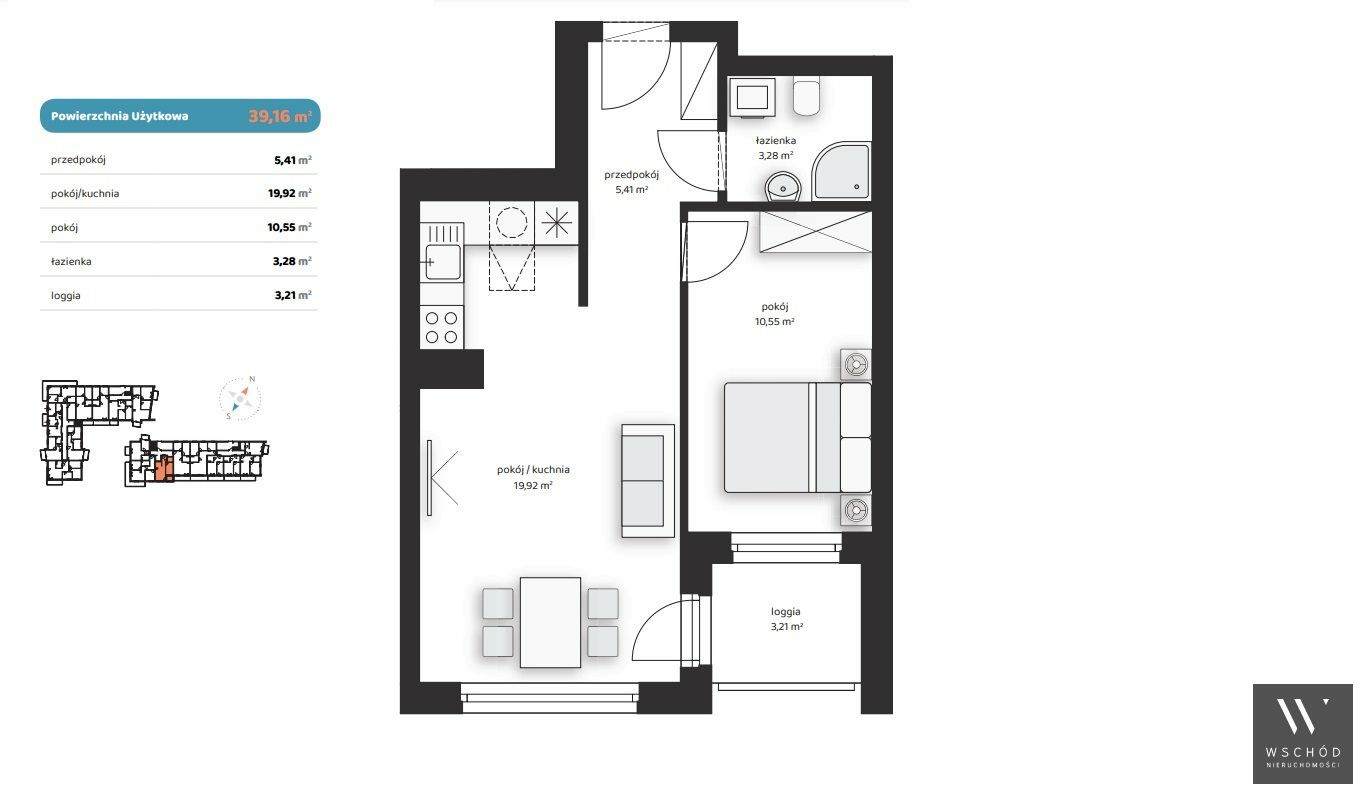 Mieszkanie składające się z salonu z aneksem kuchennym, sypialni, przedpokoju, łazienki oraz loggi