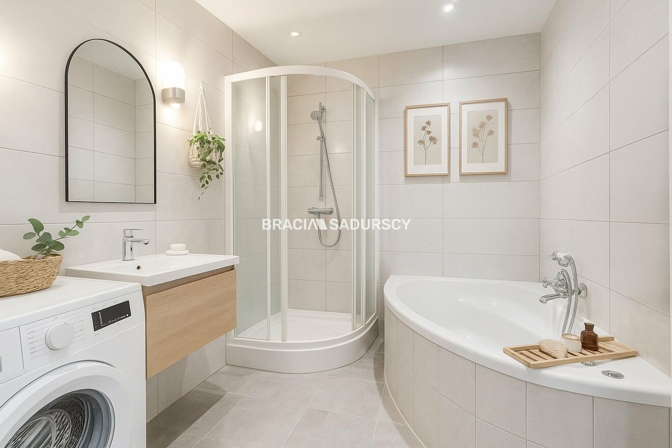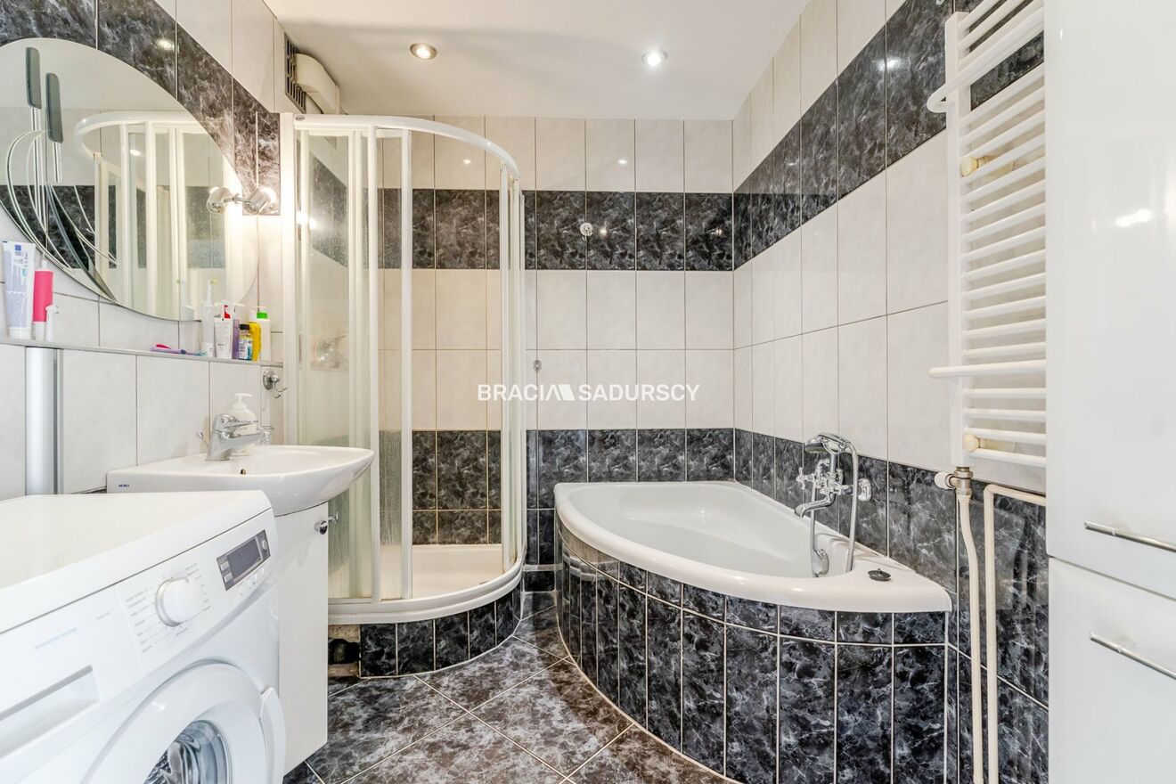Wyposażenie łazienki: wanna, umywalka, pralka, lustro, kabina prysznicowa |
