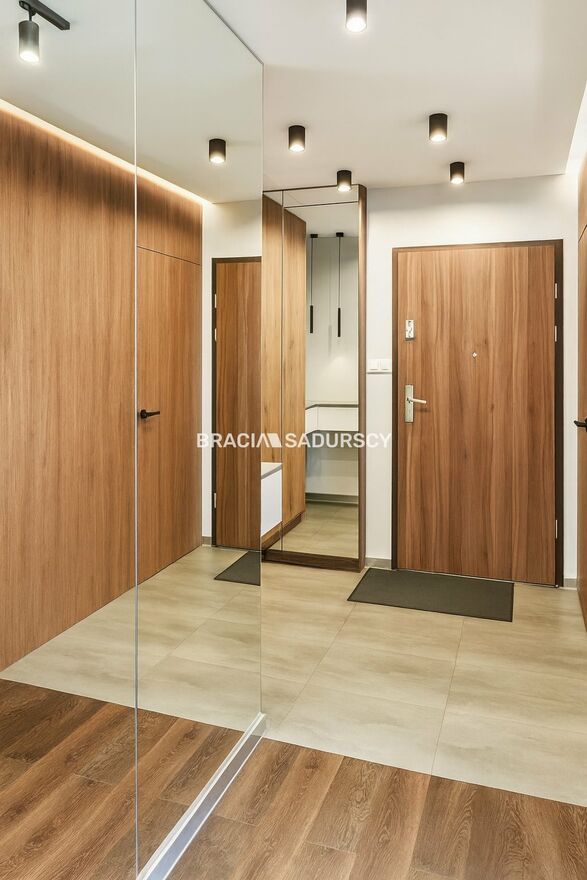Mieszkanie położone jest na piątym piętrze. Ma widok na panoramę miasta dzięki sporemu oddaleniu od okolicznych budynków. Od razu po wejściu do mieszkania widać, że zostało zaprojektowane i wykończone z gustem, a przede wszystkim - praktycznością. Przy wejściu do mieszkania mamy okazałą garderobę oraz szafę zrobioną na zamówienie. Drzwi do pomieszczeń zostały ukryte za tapetą, która jest motywem powtarzającym się i tworzącym spójną całość wykończenia.
