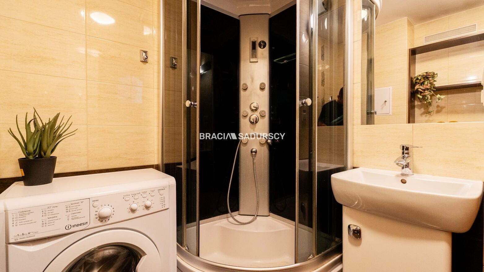 Wyposażenie łazienki: umywalka, lustro, kabina prysznicowa |