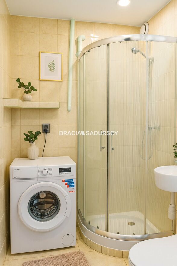 - łazienka z prysznicem i pralką,