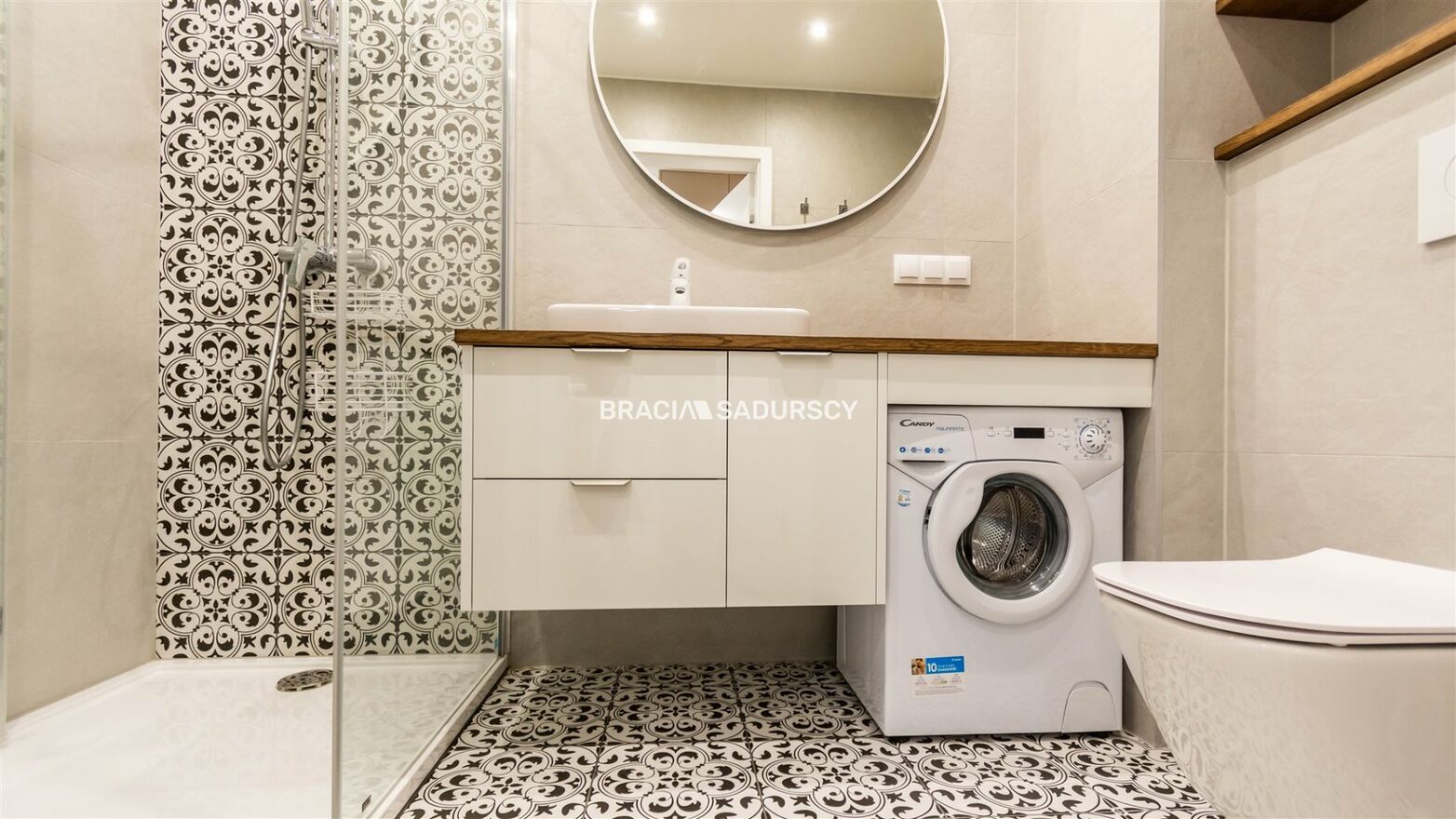 Wyposażenie łazienki: WC, umywalka, pralka, lustro, kabina prysznicowa |