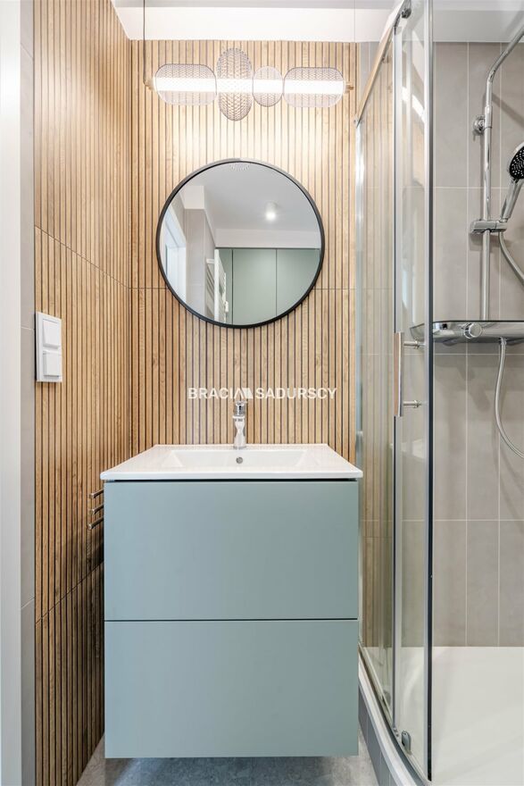 W łazience kabina prysznicowa, umywalka z szafką, lustro, szafka nad toaletą oraz miejsce na pralkę.