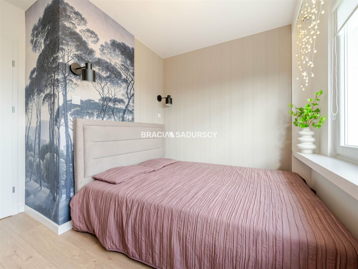 Sypialnia w ciepłej beżowej kolorystyce z atrakcyjną tapetą, wyposażona w dwuosobowe welurowe łóżko, pojemną szafę w zabudowie oraz miejscem do pracy.
