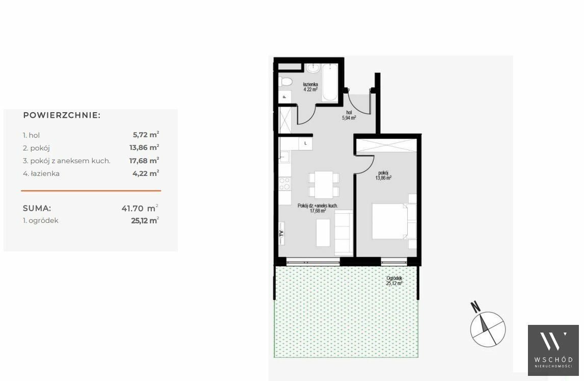 Mieszkanie składające się z salonu z aneksem kuchennym, sypialni, przedpokoju, łazienki oraz ogródka.