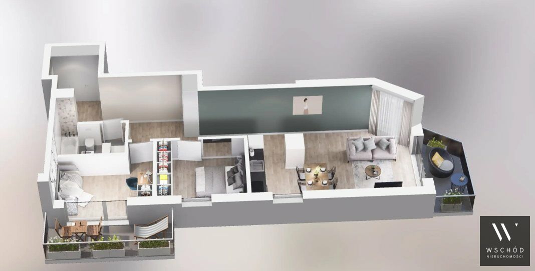 Mieszkanie składające się z salonu z aneksem kuchennym, dwóch sypialni, przedpokoju, łazienki oraz dwóch balkonów