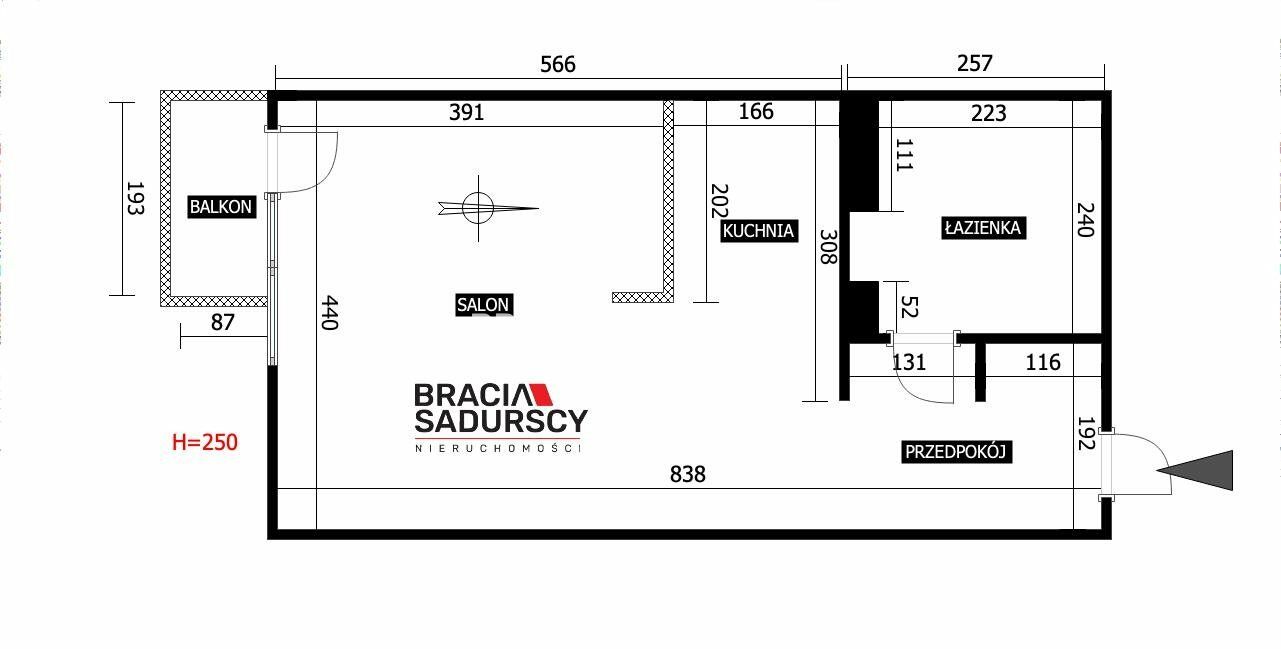 Mieszkanie składa się z przestronnego pokoju dziennego z aneksem kuchennym, z którego prowadzi wyjście na balkon, łazienki z WC oraz przedpokoju. Przemyślany układ pozwala na wygodne wydzielenie strefy wypoczynkowej i jadalnianej.