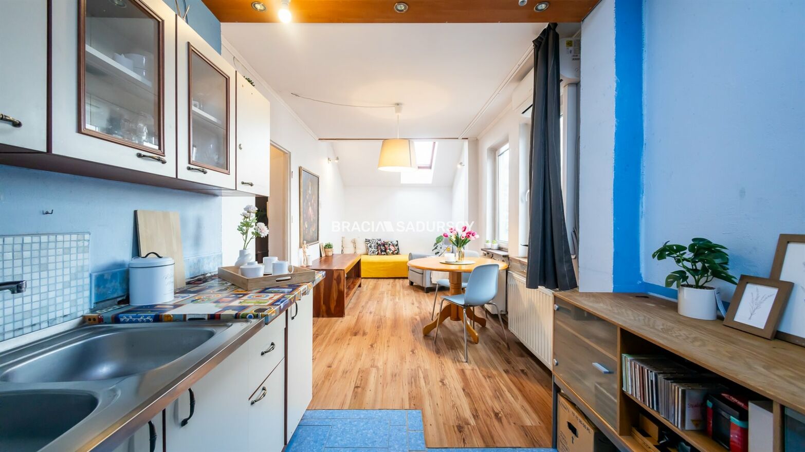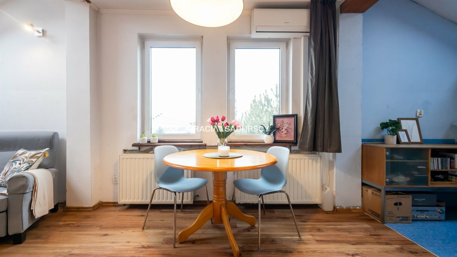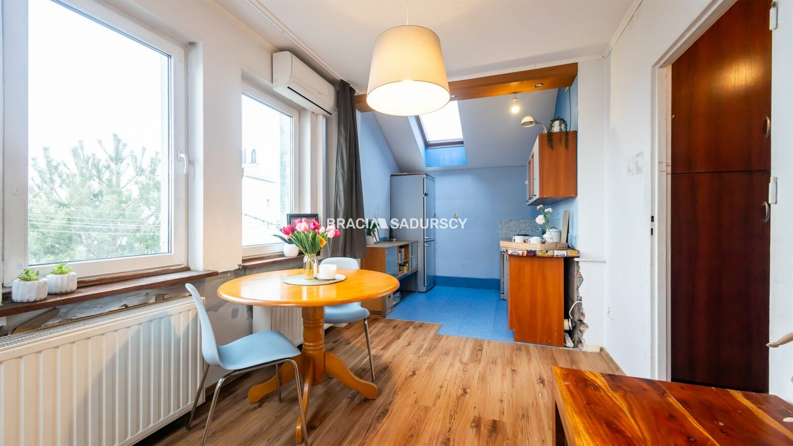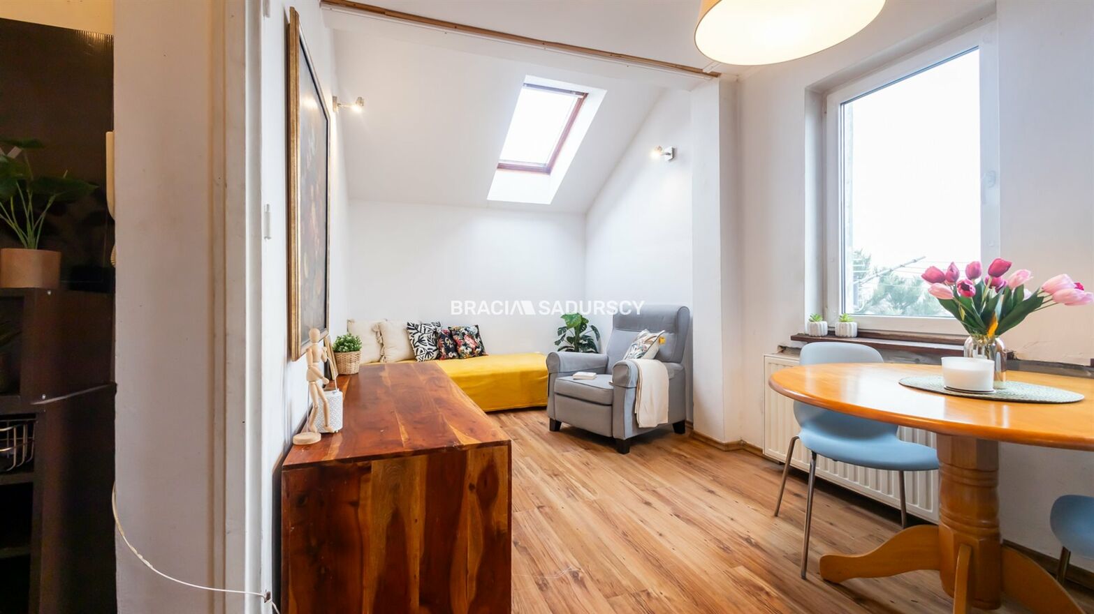 Z okien salonu rozpościera się piękny widok na dachy pobliskich budynków i drzewa, a wnikliwe oko przy dobrej pogodzie dostrzeże nawet Kopiec Kościuszki. Ustawny salon połączony z jadalnią i kuchnią stanie się sercem domu, w którym chętnie odpoczniemy w gronie rodziny czy przyjaciół.