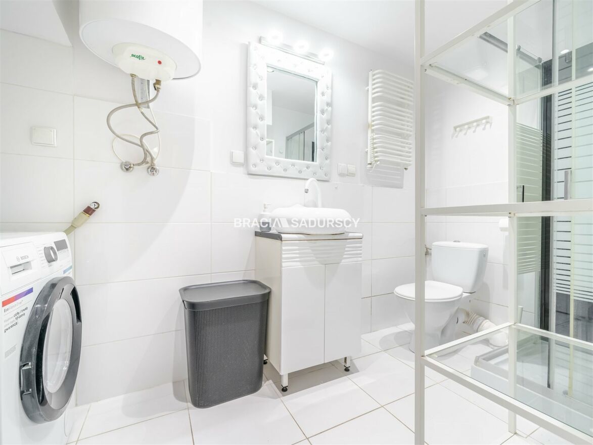 Wyposażenie łazienki: WC, pralka, kabina prysznicowa
