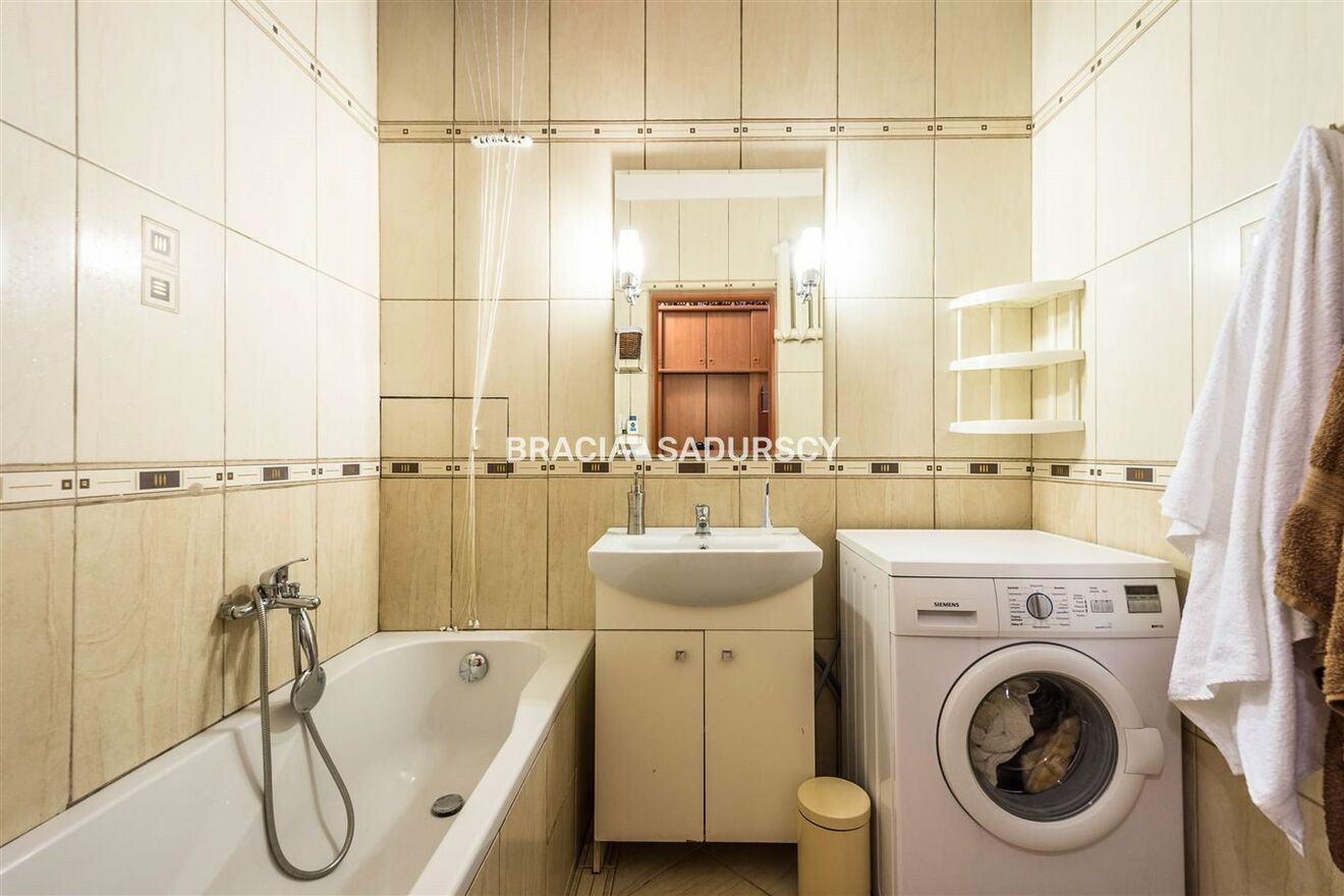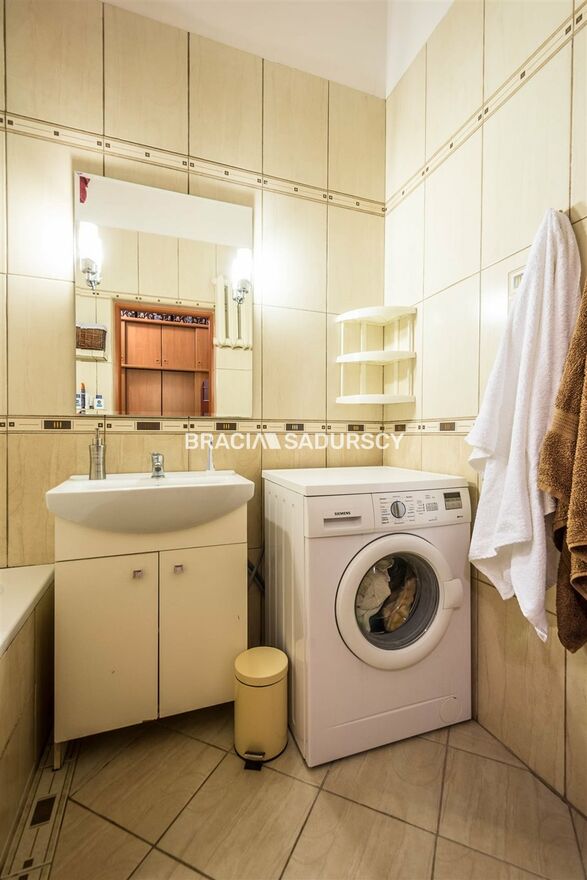 Wyposażenie łazienki: umywalka, prysznic, pralka, lustro |