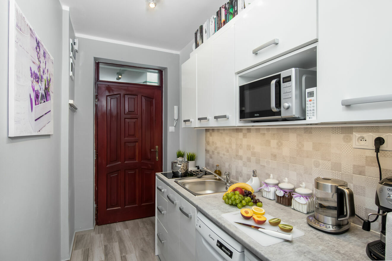 - przedpokoju z pełni wyposażonym aneksem kuchennym