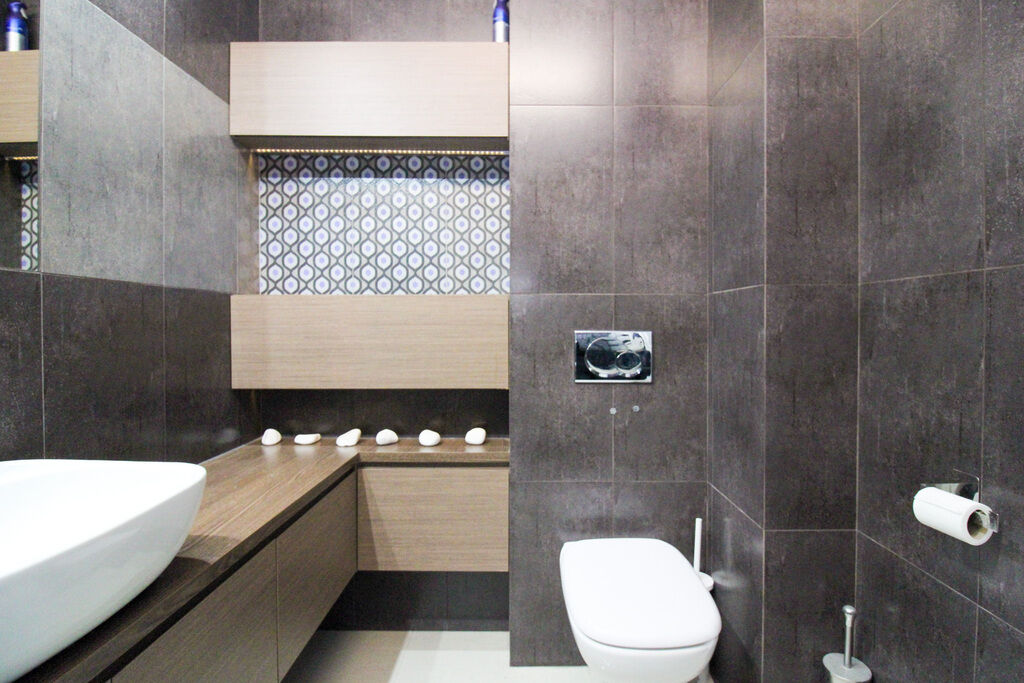 W łazience: prysznic, nablatowa umywalka, pralka Samsung,