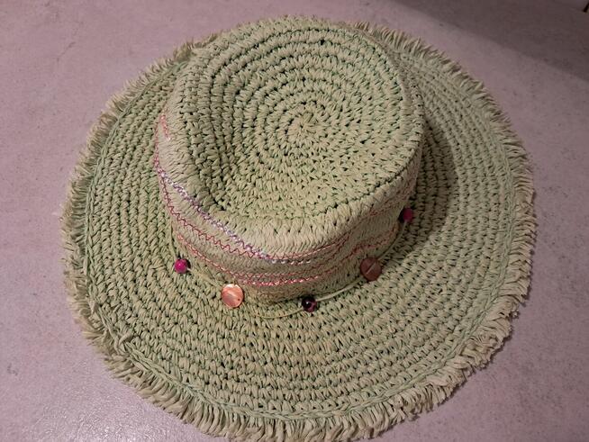 Do sprzedania, damski seledynowy letni kapelusz o strukturze siateczkowej, z ozdobami w tonacji czerwieni i frędzelkami ...