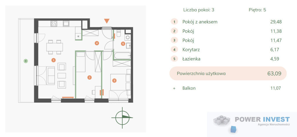 Mieszkanie znajduje się na 5 piętrze. Lokal ma powierzchnię 63,09
