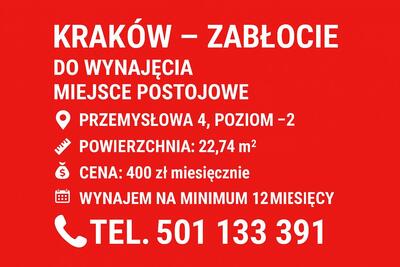 Do wynajęcia miejsce postojowe Kraków, Przemysłowa 4, poziom –2 Powierzchnia: 22,74 m² Cena: 400 zł ...