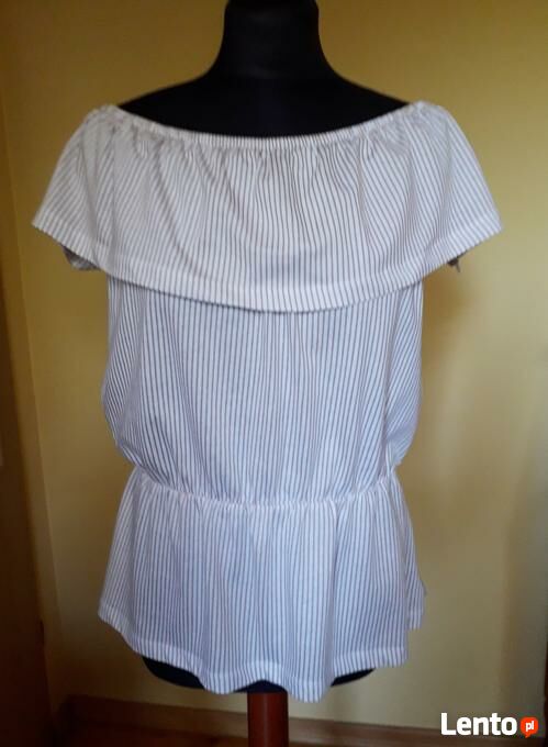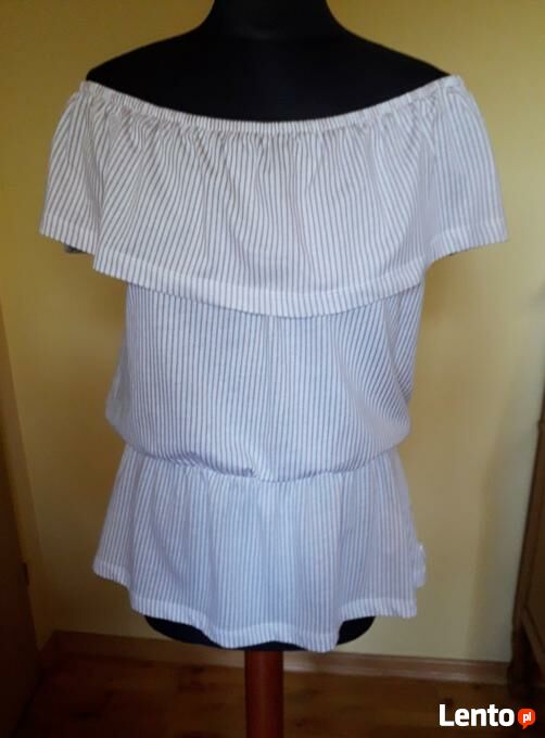 Odsprzedam bluzkę hiszpankę w biało-brązowe prążki. Nowa, nie noszona, ale bez papierowej metki. Bluzeczka ma krótki rękaw, falbanę i gumkę przy dekolcie oraz baskinkę na gumce na dole.Rozmiar z metki M.