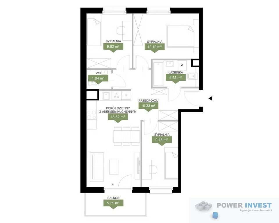 – posiada trzy osobne sypialnie, przestronny salon z aneksem