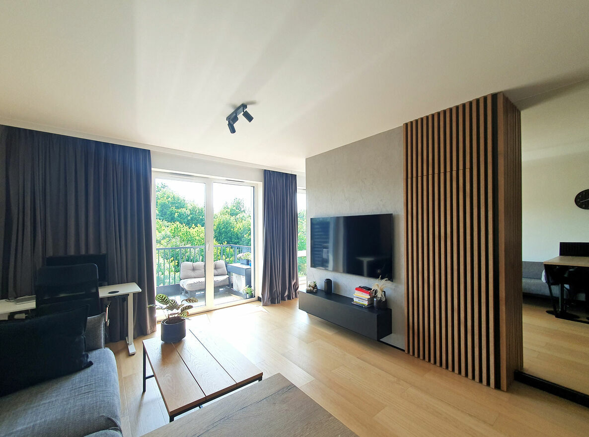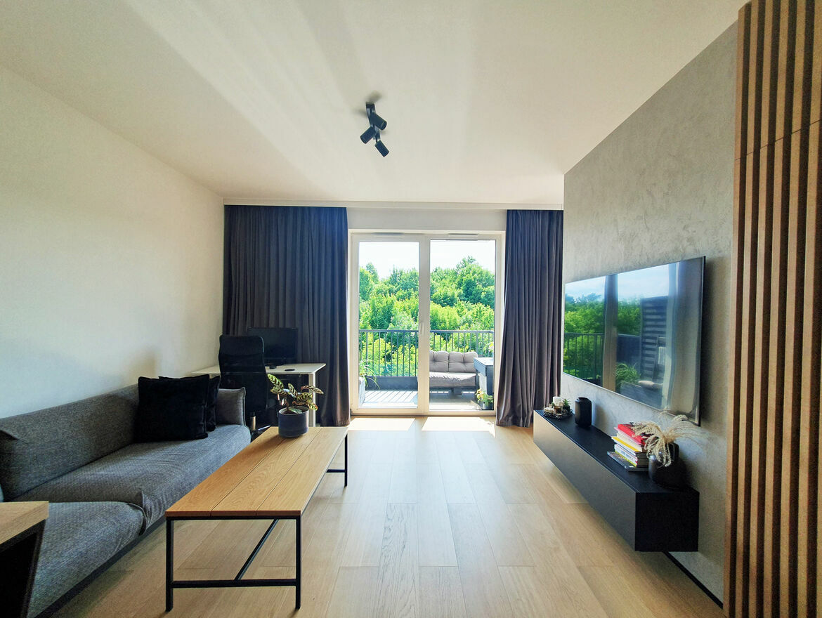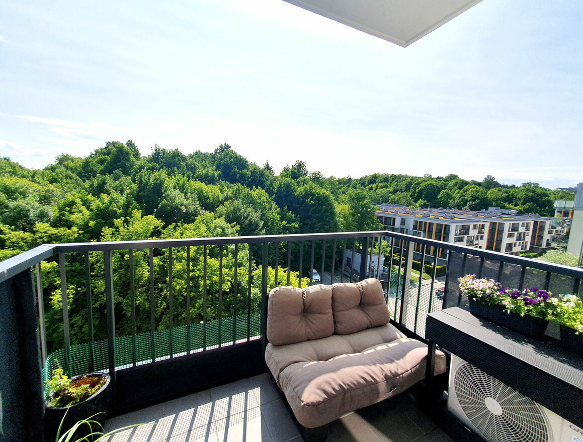 Przestronny balkon z niezakłóconym widokiem na zieleń i panoramę miasta