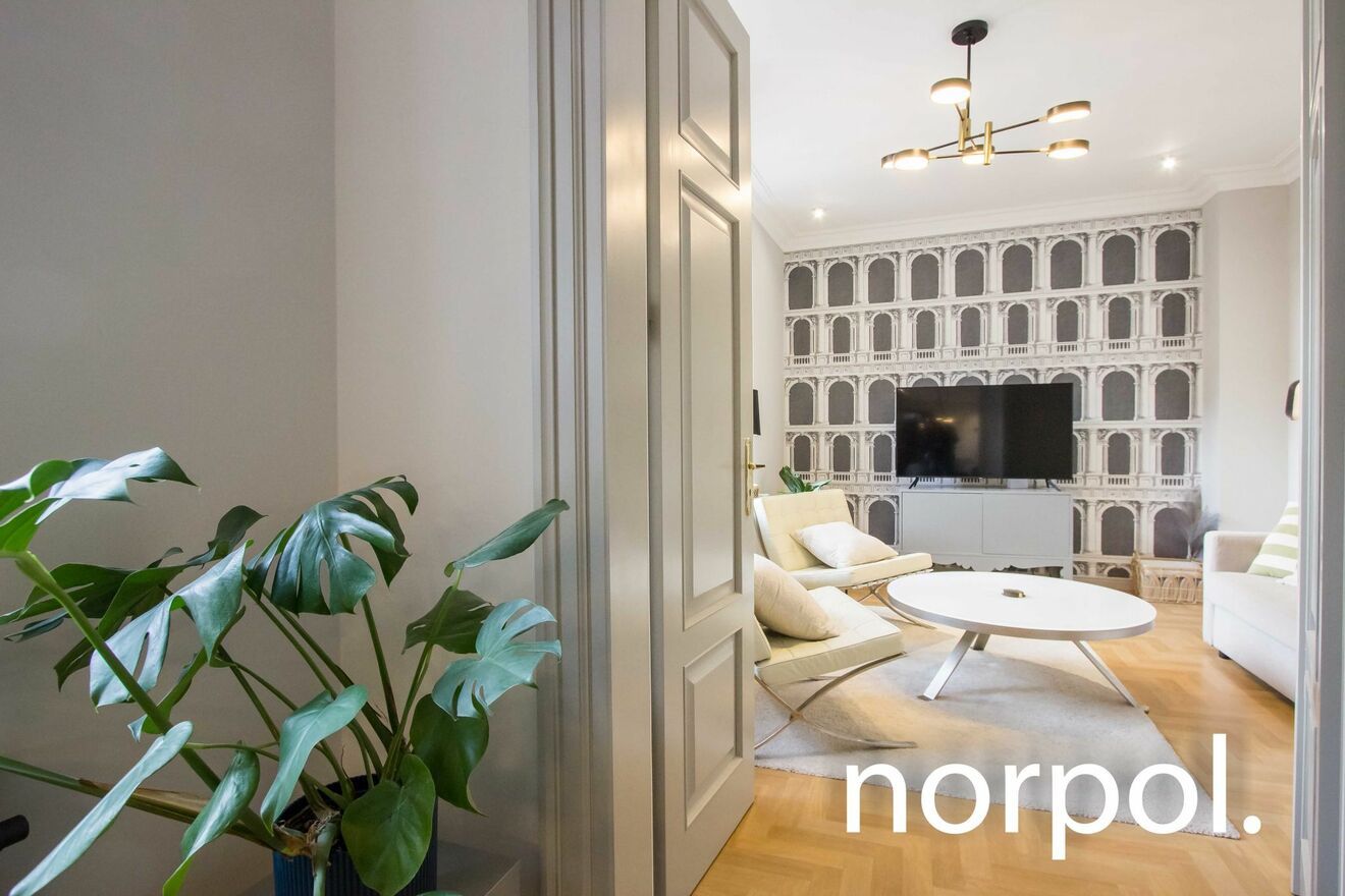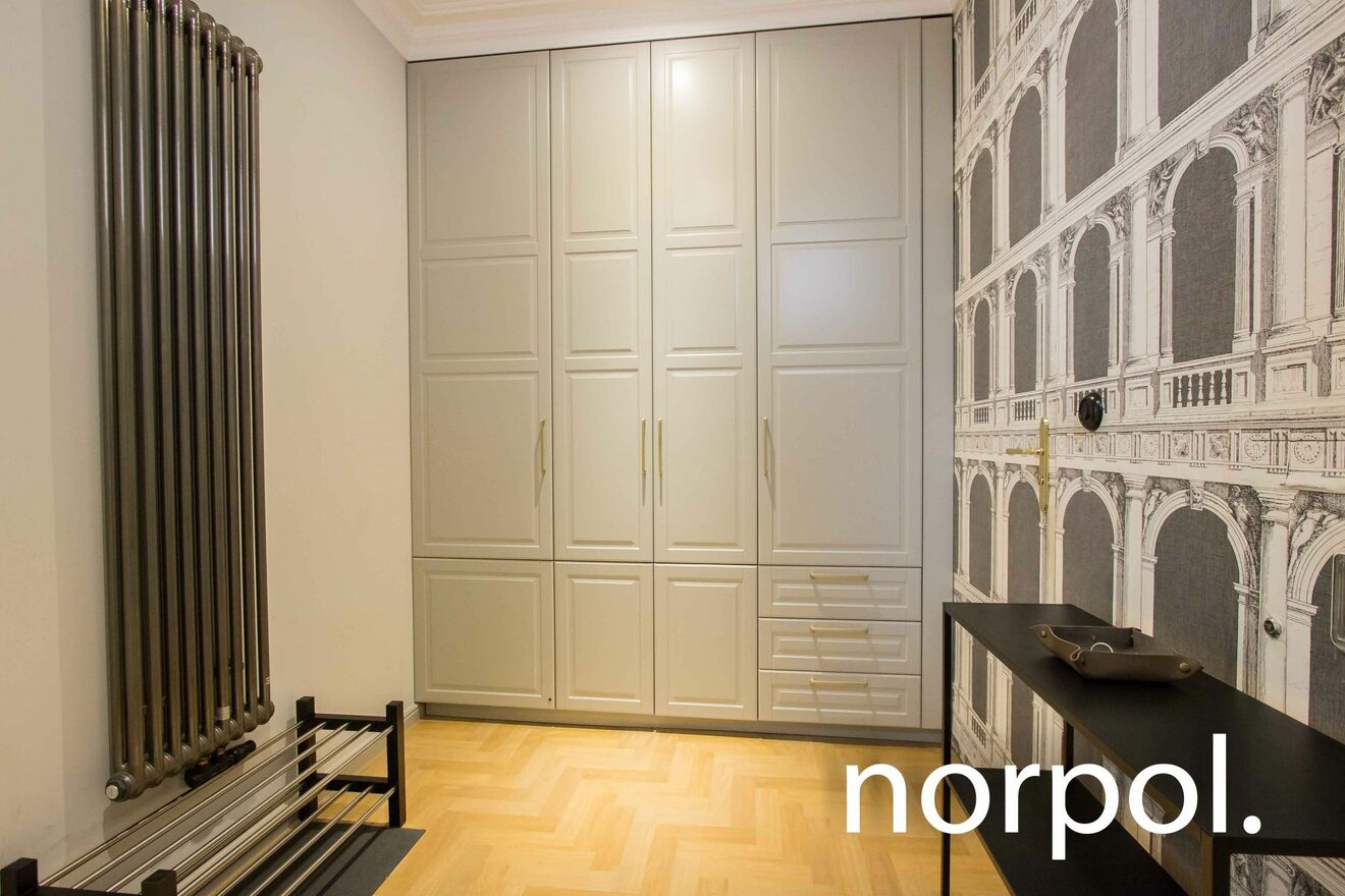 Charakter mieszkania podkreśla drewniana podłoga. Ekskluzywne materiały tworzą elegancką atmosferę.