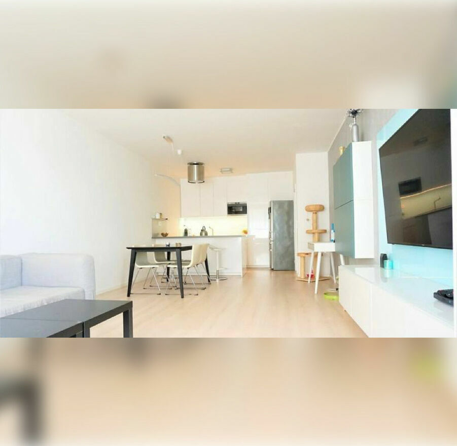 Mieszkanie jest wykończone wysokiej jakości materiałami i wyposażone w nowoczesne sprzęty, takie jak zmywarka, lodówka, piekarnik i telewizor.