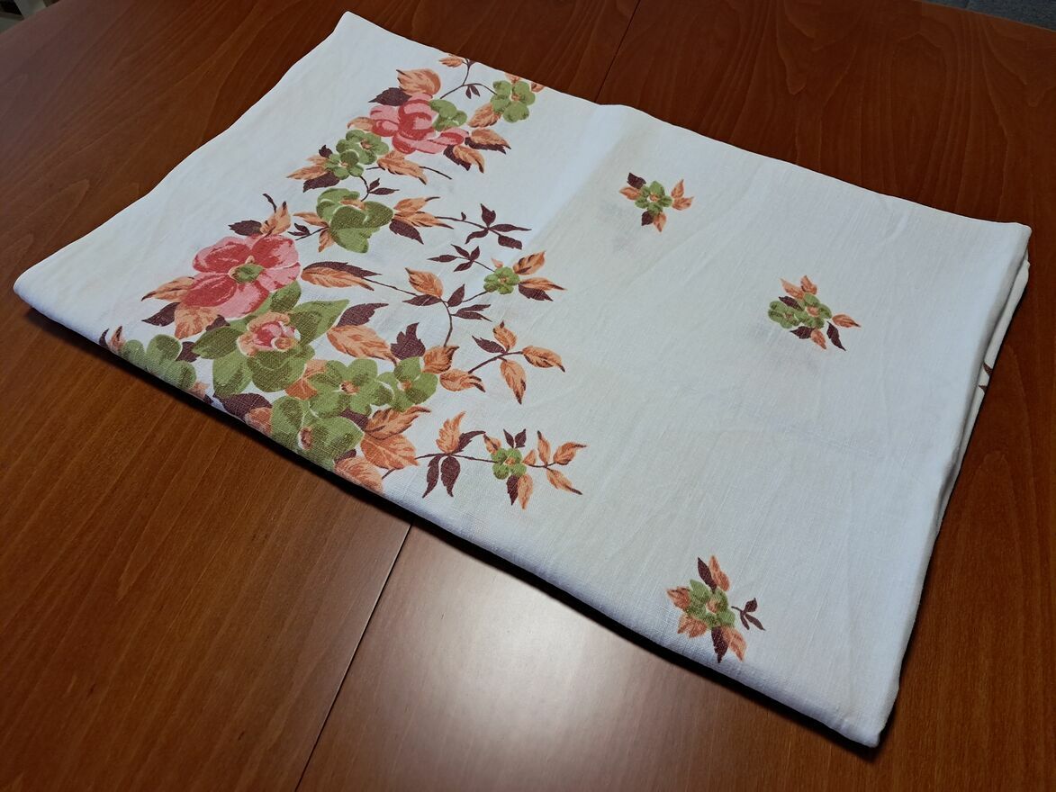 Do sprzedania obrus lniany (gruby), prostokątny, biały w kolorowe (czerwień, zieleń, brąz) kwiaty, o wymiarach w cm: 166 x 130.Obrus mało używany.