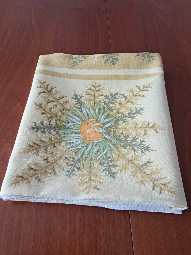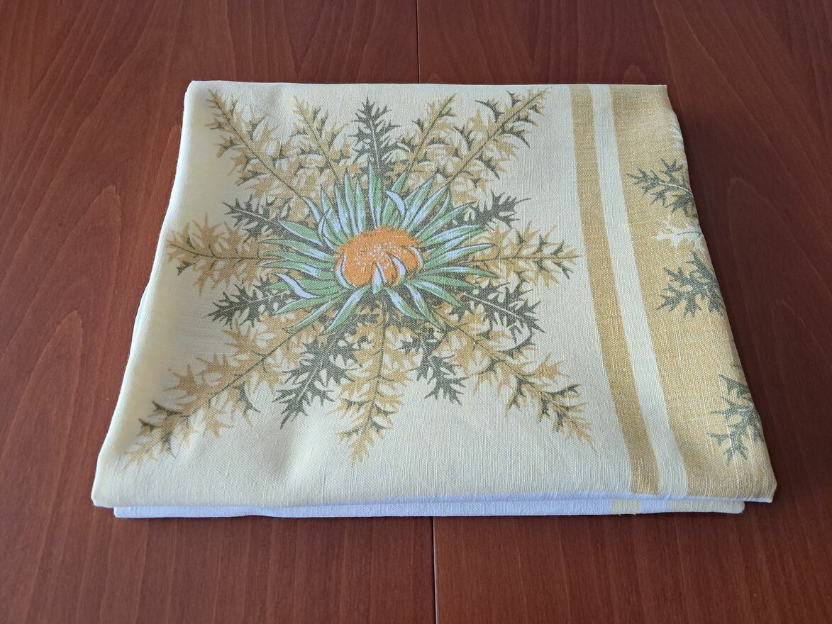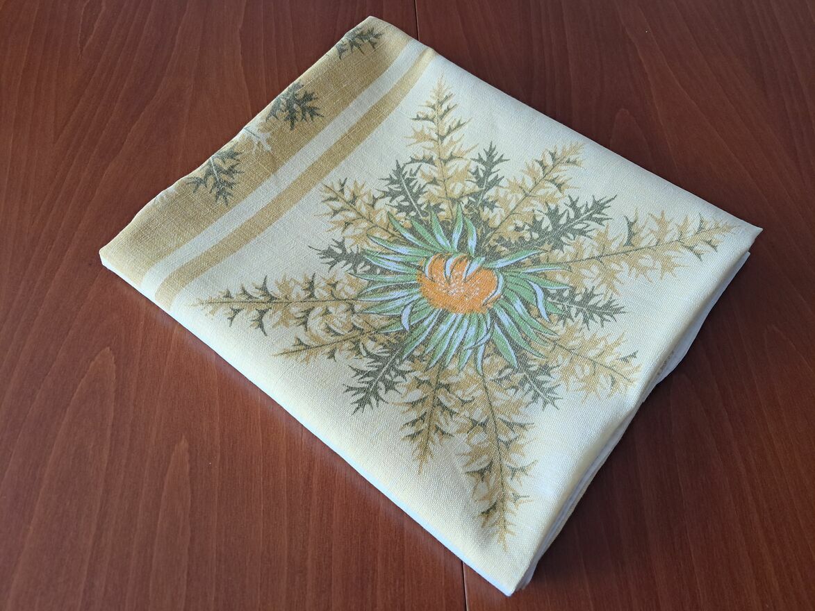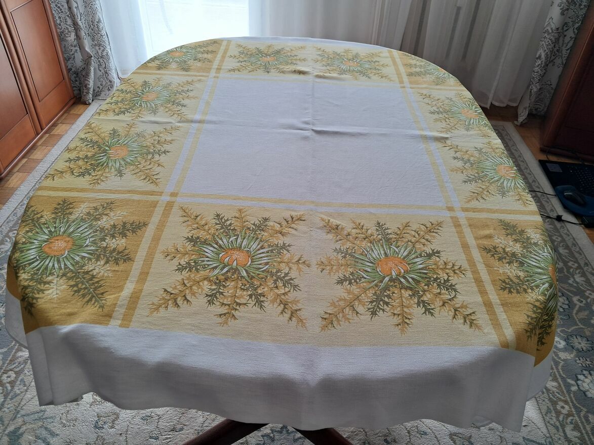Do sprzedania obrus lniany, prostokątny, biały w motywy kwiatowe (słoneczniki) w odcieniach żółci i zieleni, o wymiarach w cm: 140 x 126.Obrus mało używany.
