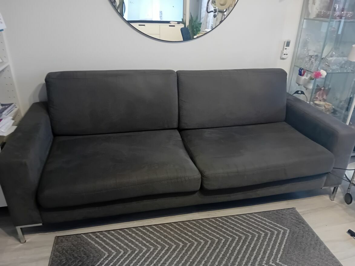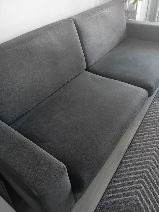 Sofa była robiona na zamówienie, nie jest rozkładana, nie ma funkcji spania ani pojemnika na pościel, ma srebrne nóżki, jej szerokość to 220 cm, całkowita głębokość 88 cm, a po zdjęciu poduch oparciowych to 75 cm, więc jedna osoba się spokojnie wyśpi, sofa jest bardzo wygodna. Pokrycia ze wszystkich 4 poduch są zdejmowalne, można je prać w pralce. Odbiór możliwy od zaraz, ew. innych informacji udzielę telefonicznie.Małgorzata