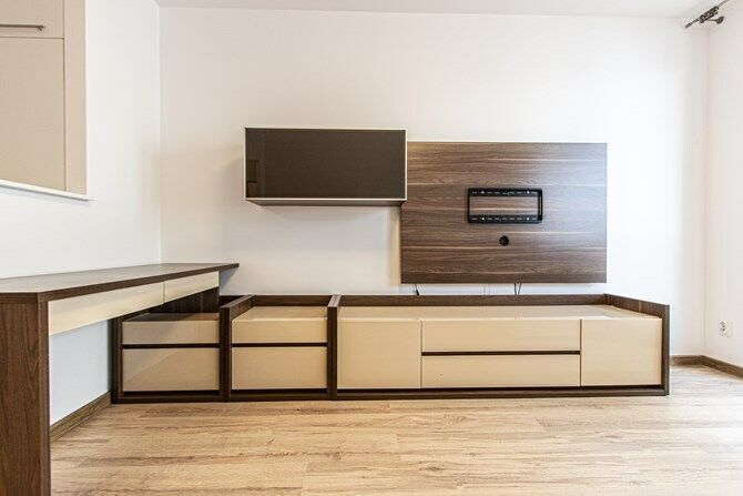 Pokój z balkonem: narożnik, meble pod telewizor, uchwyt TV, biurko.