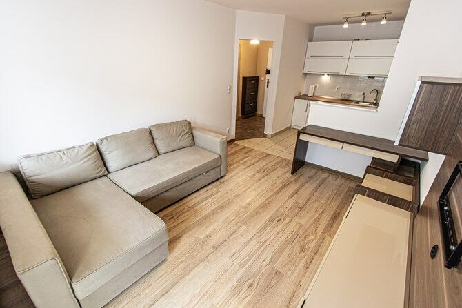 Mieszkanie dwupokojowe z aneksem kuchennym oraz balkonem.