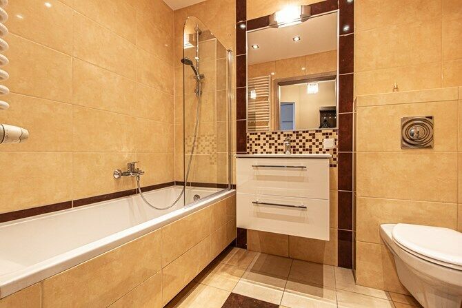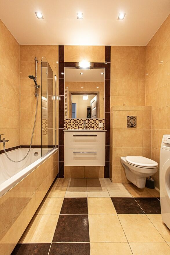 Łazienka: wanna, umywalka, WC, pralka, szafka.