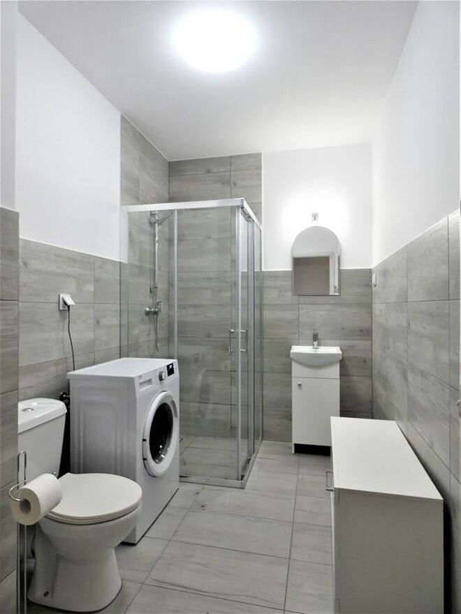 Łazienka: kabina prysznicowa, szafka, umywalka, pralka, WC.