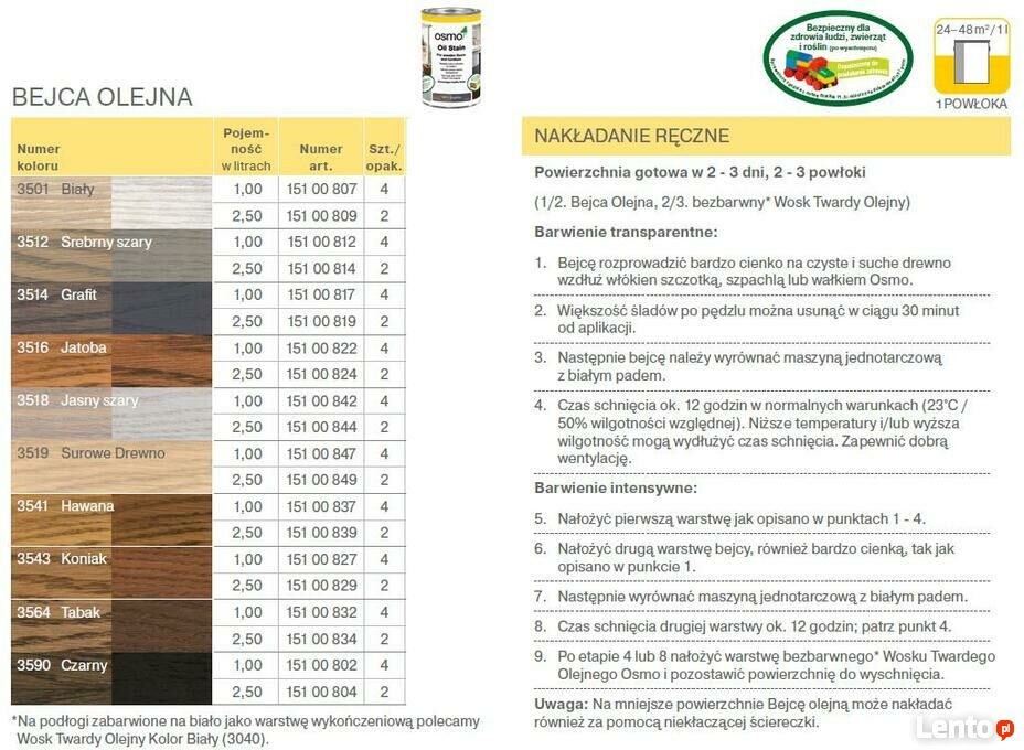 Bejca Olejna Osmopozwala na intensywne barwienie drewnianych powierzchni podłóg. Powierzchnię należy wykończyć jednym z bezbarwnych wosków Twardych Olejnych Osmo. Uzyskana mikroporowa powłoka pozwala drewnu swobodnie oddychać.