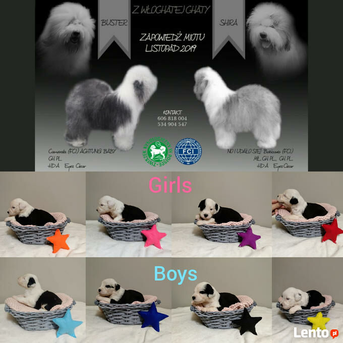 Dnia 11.11.2019r na świat przyszło 8 słodkich kluseczek, 4 chłopców i 4 dziewczynki. Nasza hodowla "Z Włochatej Chaty" zarejestrowana jest w Związku Kynologicznym w Polsce (ZKwP), która powstała z miłości do Owczarków Staroangielskich. Każdy pies w naszym domu traktowany jest jak członek rodzinyRodzice szczeniąt zostali przebadani pod kątem dysplazji z wynikiem HD-A (wolni od dysplazji) oraz dziedzicznych chorób oczu.