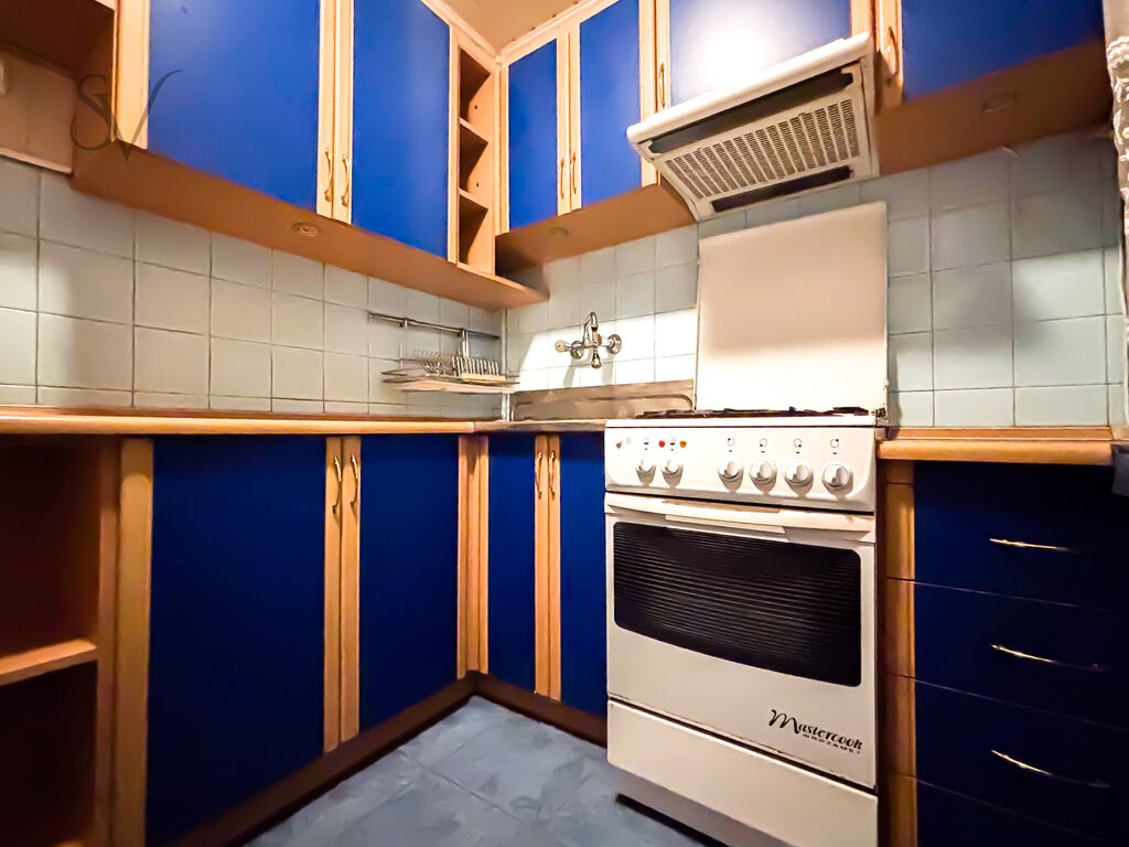 microwave, TV, oven, stove, extractor hood, refrigerator with freezer,