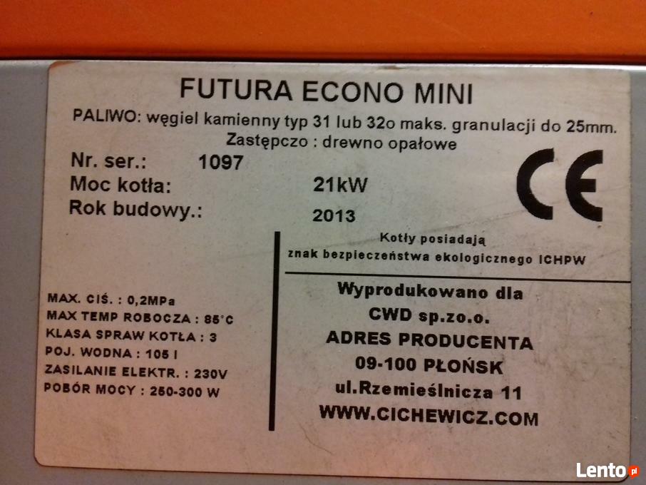 Do sprzedania kocioł grzewczy Cichewicz Futura Econo Mini 21 kW z podajnikiem na ekogroszek. Możliwość palenia drewnem na dodatkowym żeliwnym ruszcie dołączonym do pieca. Powierzchnia grzewcza pieca to 80-240 m2. Znak ekologiczny ICHPW gwarantuje niską emisję spalin.Kocioł zakupiony w 2013 roku i użytkowany do wiosny 2019. Sprzedawany z powodu konieczności wymiany na ogrzewanie gazowe.