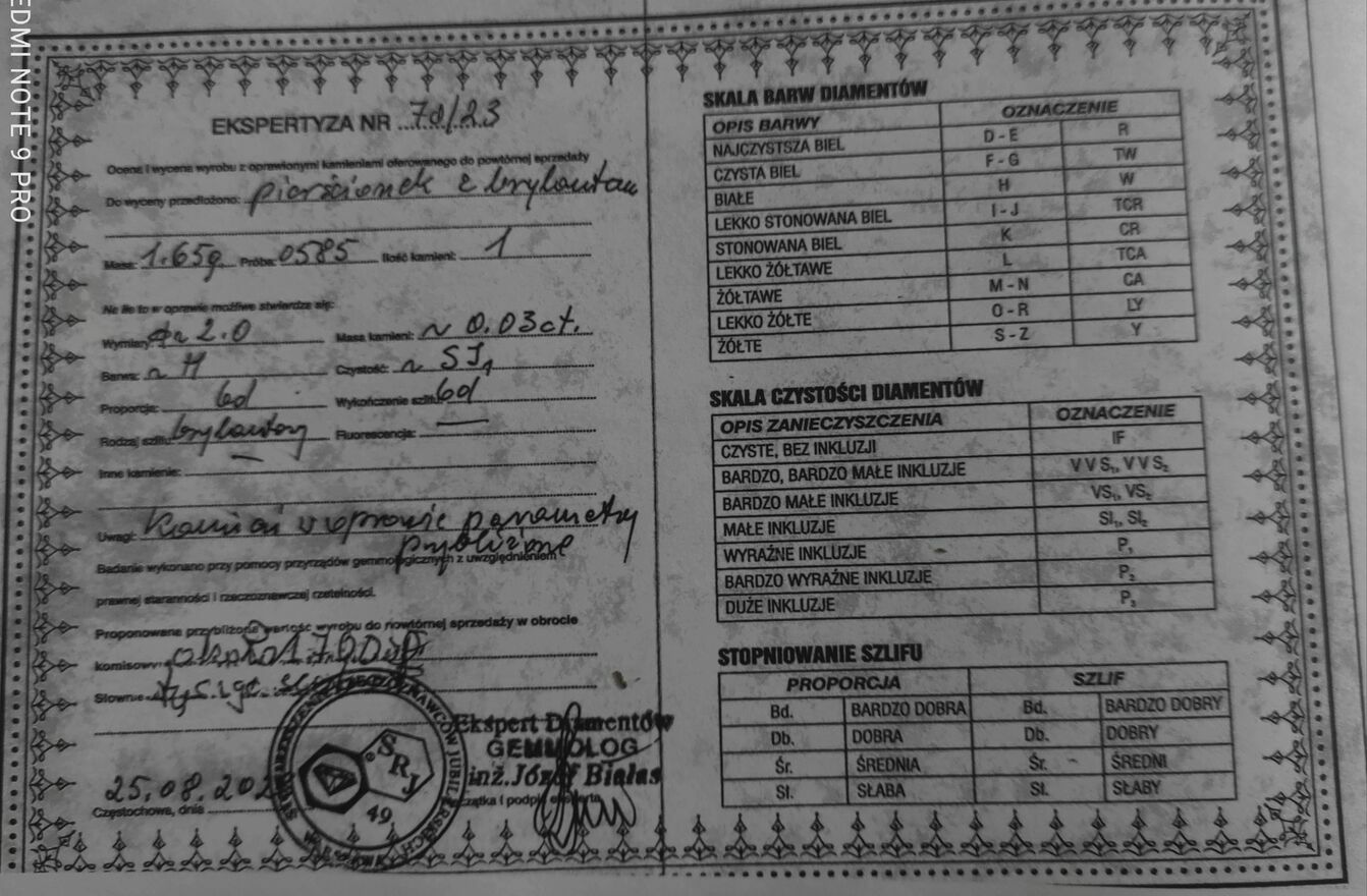 Pierścionek z brylantem wraz z certyfikatem. Średnica pierścionka mierzona suwmiarką od środka 18 mm .Wszystkie dane zawarte w certyfikacie umieszczonym na foto. Cena 1300 zł nie podlega negocjacji. Możliwość sprawdzenia u jubilera. Tel 514 - pokaż numer telefonu -Janusz