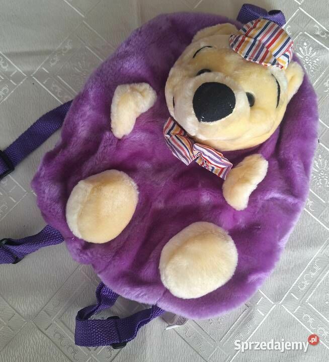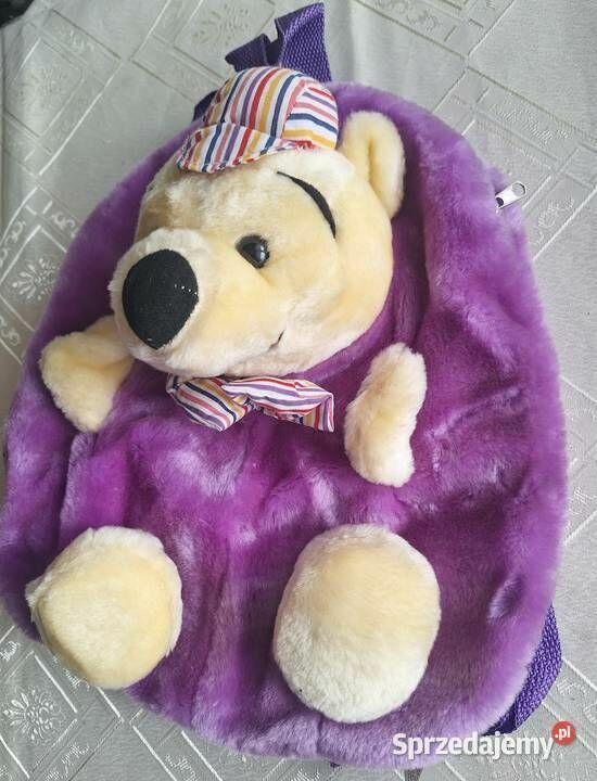 Plecak pluszowy Miś Puchatek – fioletowy, miękki, z zamkiem Na sprzedaż oryginalny plecak dziecięcy w formie maskotki misia – miękki, przyjemny w dotyku, idealny dla przedszkolaka lub na prezent. Charakterystyka: Plecak wykonany z pluszu w kolorze fioletowym Przód ozdobiony dużym misiem (przypomina Kubusia Puchatka w czapeczce i muszce w paski) Zamek błyskawiczny z tyłu – możliwość przechowywania drobiazgów Lekki, wygodny, z regulowanymi paskami Idealny na spacery, do przedszkola lub jako element zabawy Stan: bardzo dobry, brak widocznych uszkodzeń Wymiary (orientacyjne): 35 cm x 25 cm Możliwa wysyłka paczkomatem lub odbiór osobisty.Sprawdź zainteresowanie tym ogłoszeniem