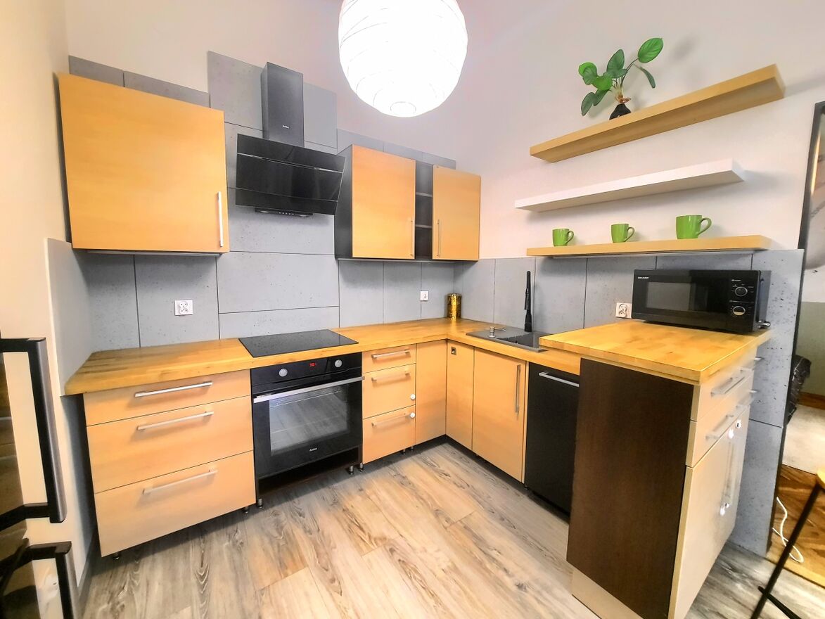 W aneksie kuchennym wykonane zostały instalacje wodne, kanalizacyjne i elektryczne. Aneks kuchenny umeblowany meblami na wymiar z wbudowanymi sprzętami AGD, zmywarką, kuchenką z piekarnikiem, okapem podłączonym do przewodów wentylacyjnych, lodówką, kuchenką mikrofalową. Aneks częściowo oddzielony od salony ladą barową z krzesłami barowymi.