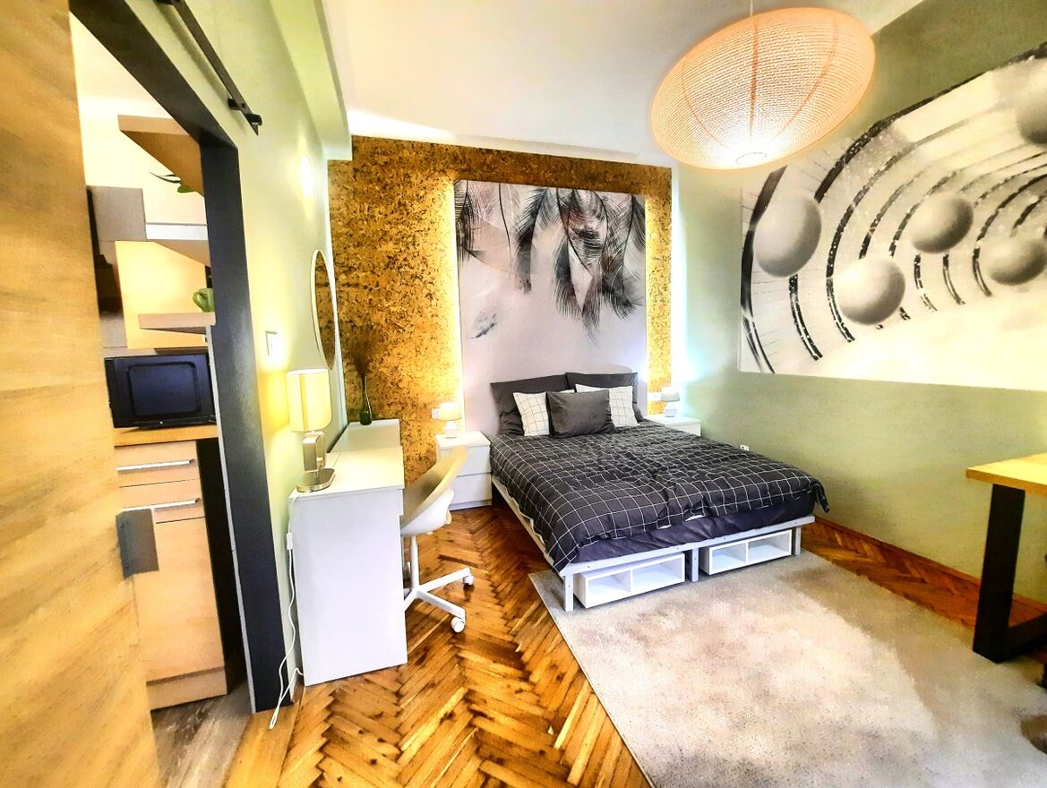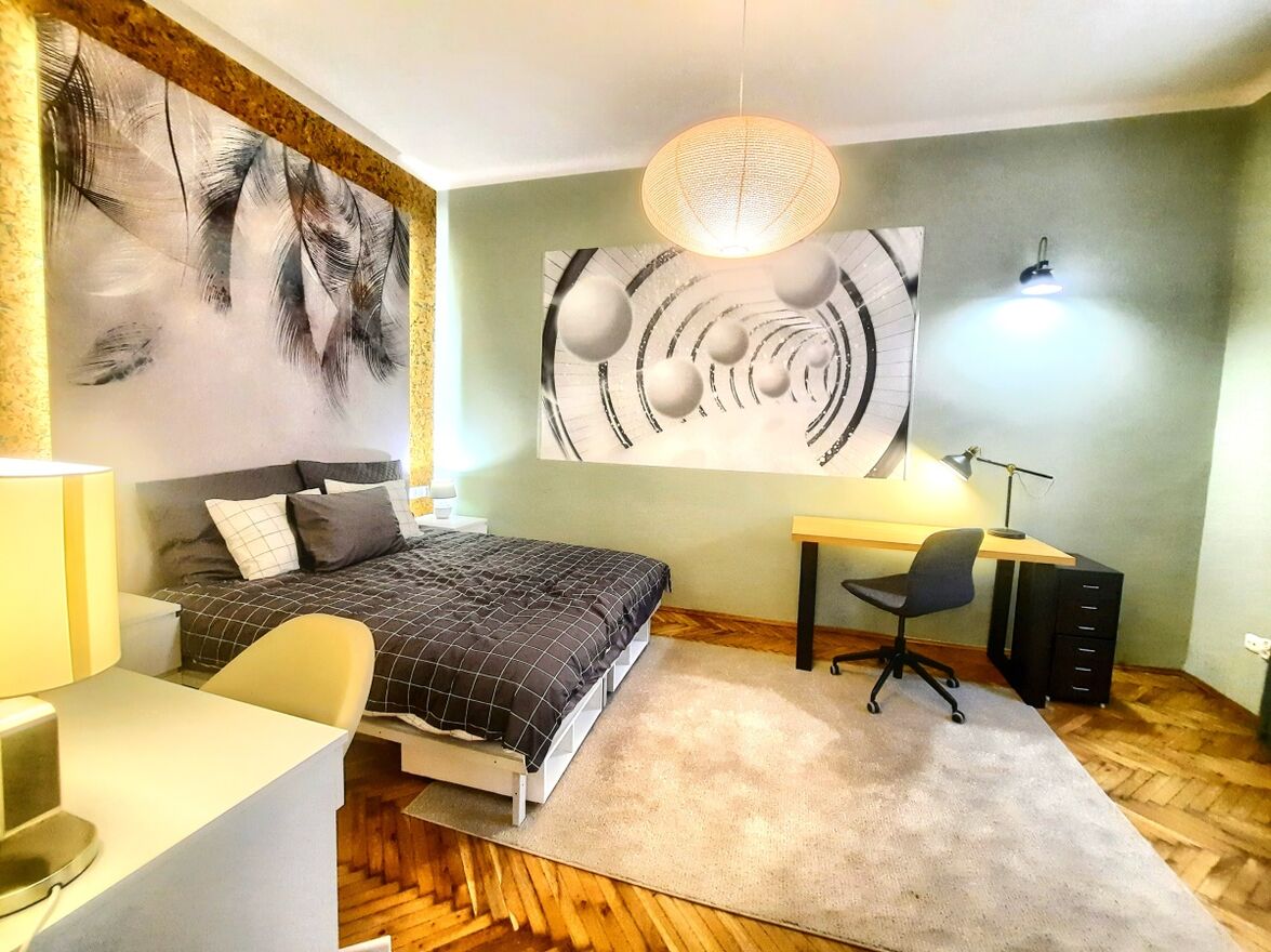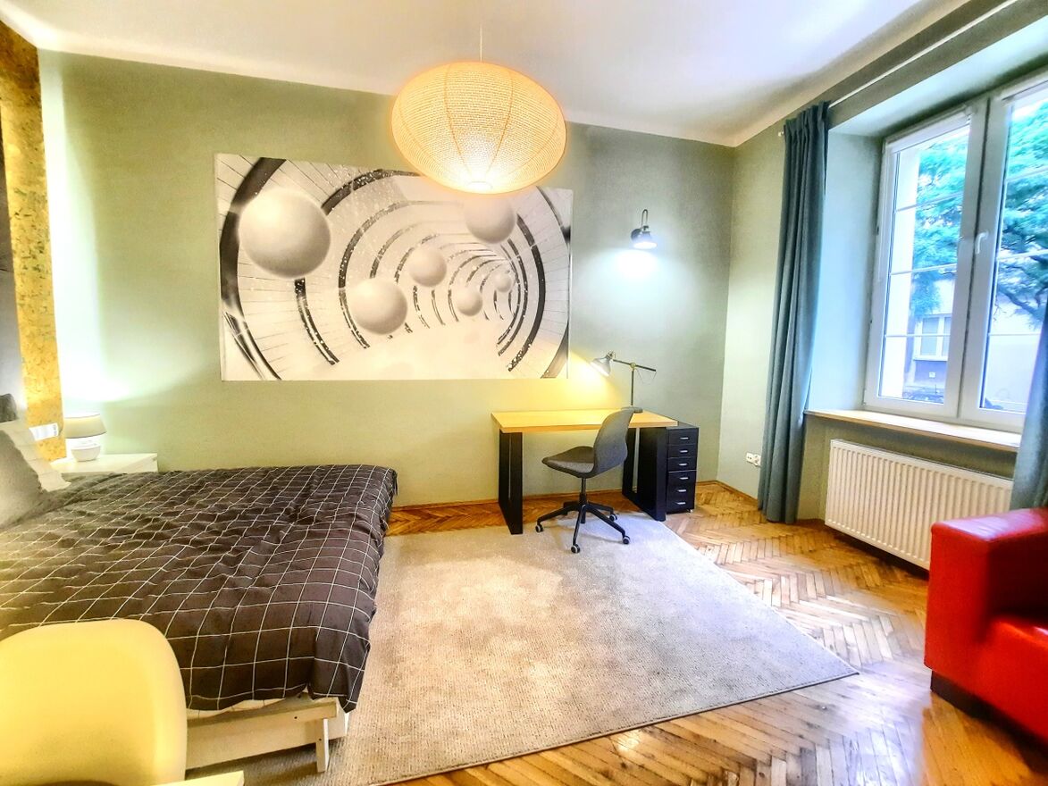 Sypialnia wyposażona w duże łóżko, stoliki nocne, biurko. W sypialni również wykonana została nowa instalacja elektryczna z wieloma punktami świetlnymi.