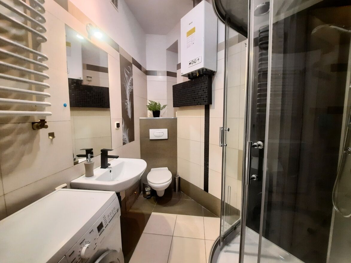 W łazience znajduje się umywalka, toaleta, oraz kabina prysznicowa. Łazienka z małym oknem do dodatkowo podnosi komfort użytkowania tego pomieszczenia