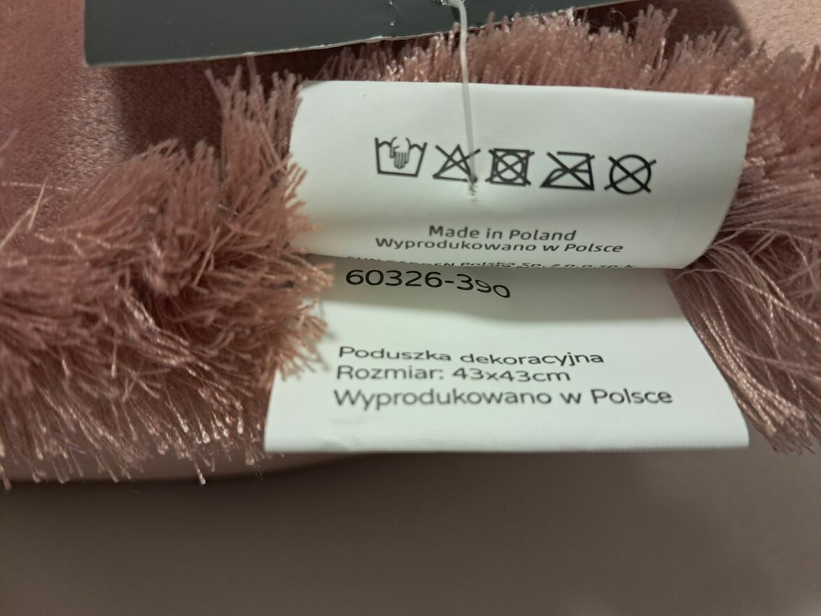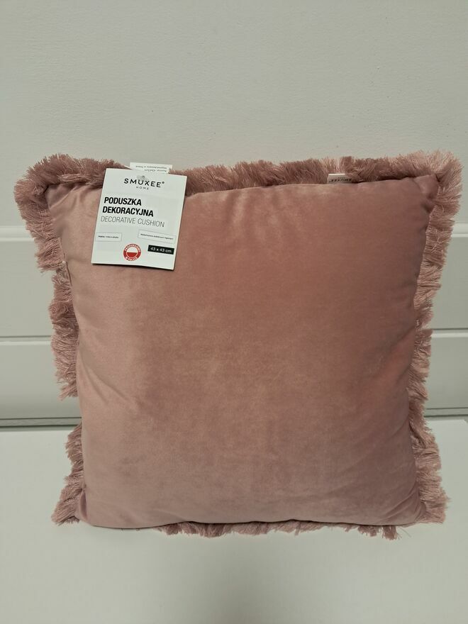 Do sprzedania nowa poduszka dekoracyjna z frędzlami „SMUKEE HOME”, w kolorze pudrowego różu (obustronnie jednakowa), miękka i miła w dotyku, wykonana z poliestru (100%), o wymiarach w cm: 43 x 43. Jestem w posiadaniu 2 identycznych sztuk. Cena z 1 szt.Poduszki nowe, nie używane, z oryginalnymi metkami.