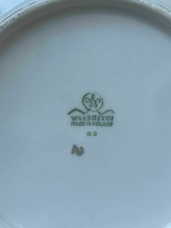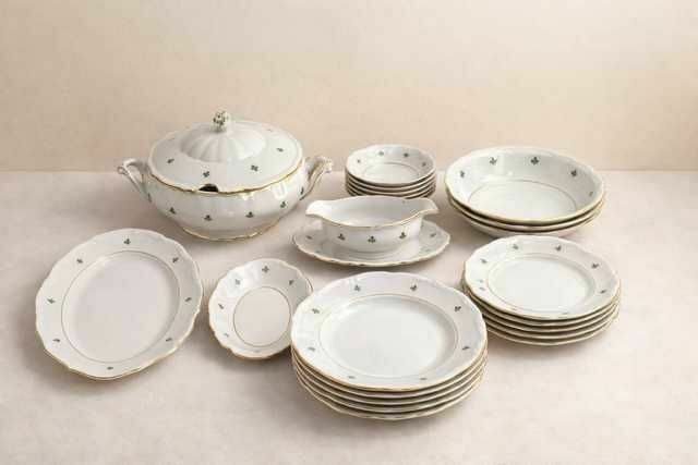 Dekoracja utrzymana jest w stonowanej, ponadczasowej kolorystyce. Na mlecznobiałym tle porcelany rozmieszczono drobne motywy roślinne w odcieniu głębokiej zieleni, przypominające stylizowane listki. Malatura jest oszczędna, regularna, co podkreśla kulturę wzorniczą serwisu. Całość dopełnia cienka, złota linia prowadzona wzdłuż krawędzi, która subtelnie akcentuje falowany kontur i dodaje kompozycji szlachetnego charakteru.