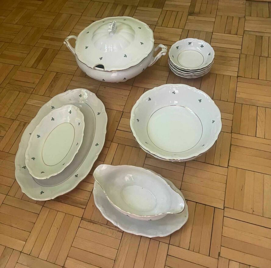 Stan serwisu określam na bardzo dobry. W domu babci był używany podczas wyjątkowych okazji i myty jedynie ręcznie, więc złocenia nie sa przetarte myciem w zmywarce..Kompletny serwis obiadowy dla 6 osób, zawiera następujące elementy: