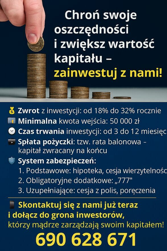 Chroń swoje oszczędności i zwiększ wartość kapitału – zainwestuj z nami!Szukasz bezpiecznego sposobu na ulokowanie środków, który zabezpieczy je przed inflacją? A może interesuje Cię inwestycja, która pozwoli znacząco pomnożyć Twój majątek? Niezależnie od celu — jesteśmy tu, by pomóc. Od lat specjalizujemy się w pośrednictwie pożyczkowym, umożliwiając inwestorom lokowanie kapitału w solidnie zabezpieczone pożyczki dla firm.