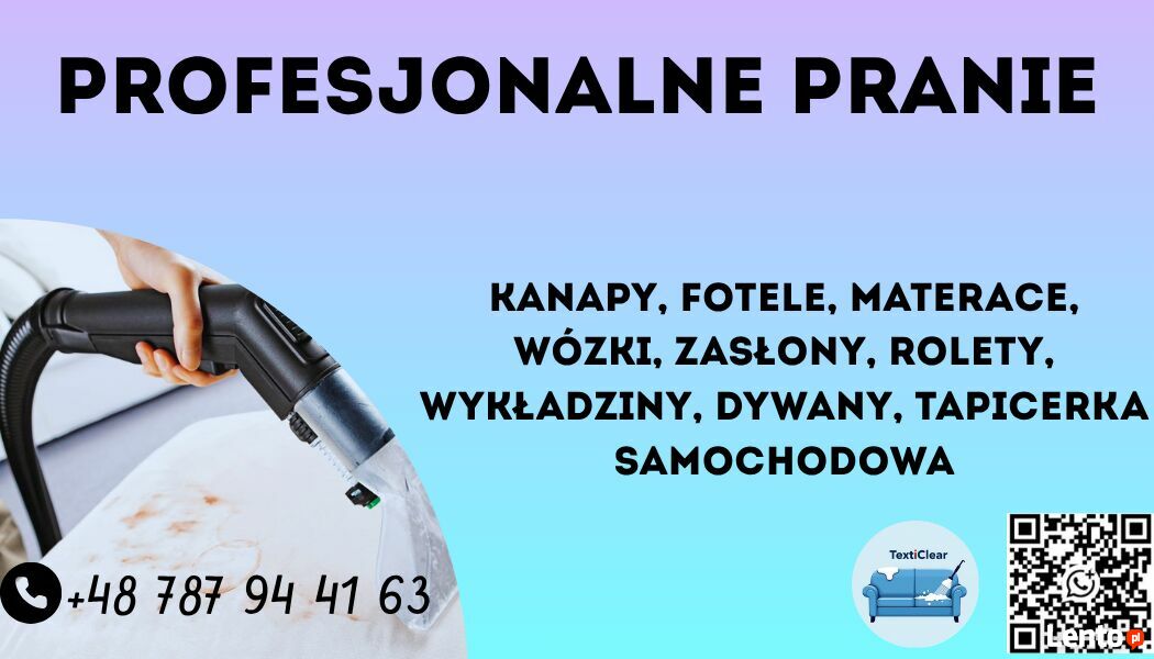- Zakres usług:Pranie tapicerki meblowej, Pranie tapicerki samochodowej